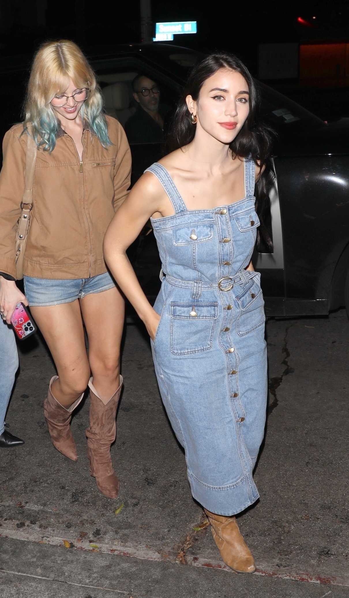 The 27-year-old actress Caylee Cowan, who made her movie debut in the 2019 film “Sunrise in Heaven”, in a blue denim dress enjoys a night out with Casey Affleck and friends at the Chateau Marmont in West Hollywood.