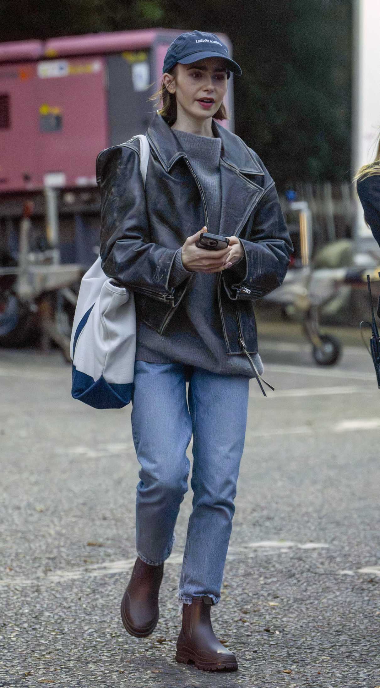 Lily Collins in a Black Leather Jacket on the Set of the Close Personal Friends in London 10/07/2025-4 Previous image Next image