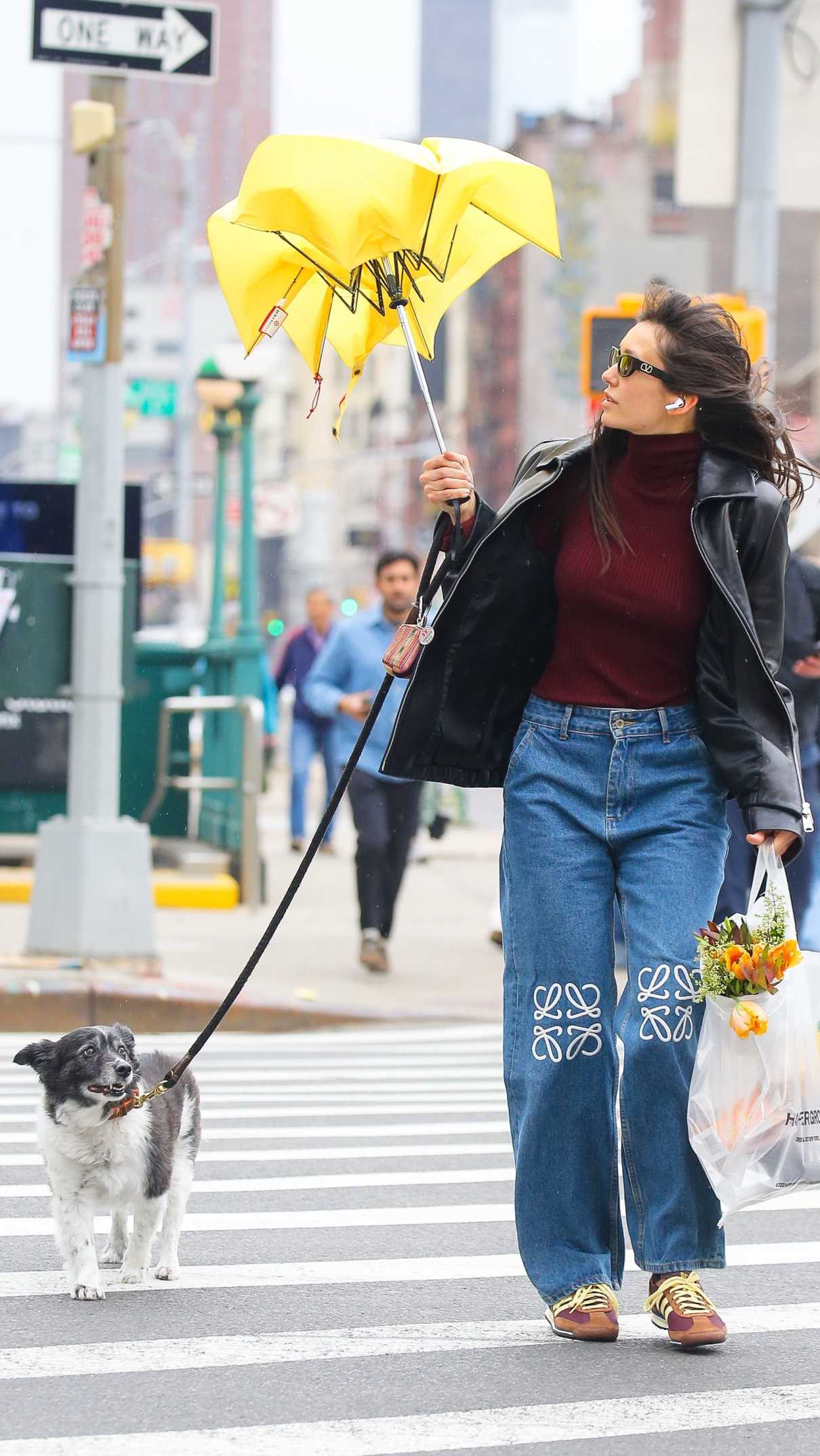 Nina Dobrev in a Black Leather Jacket Walks Her Dog in New York 04/04/2026